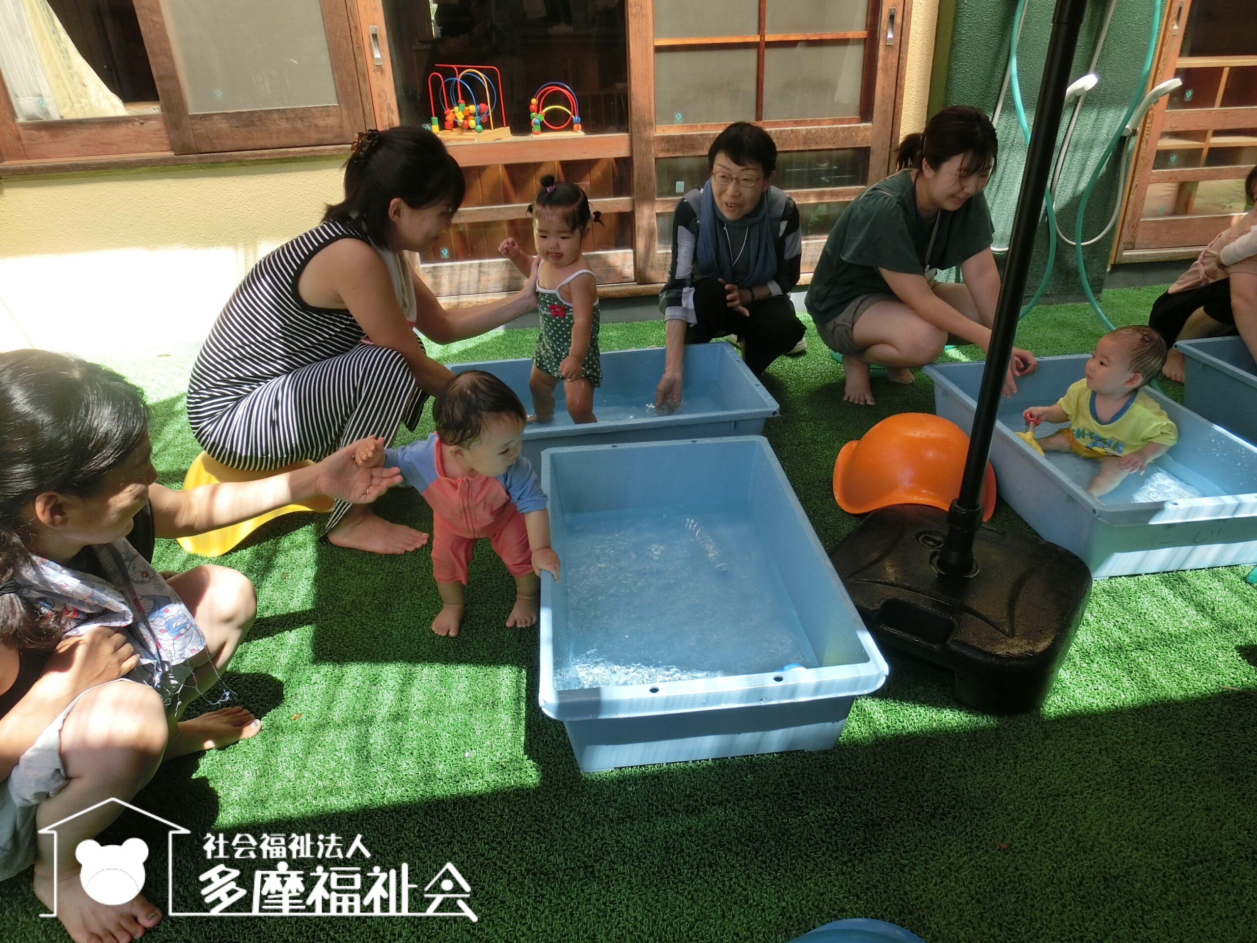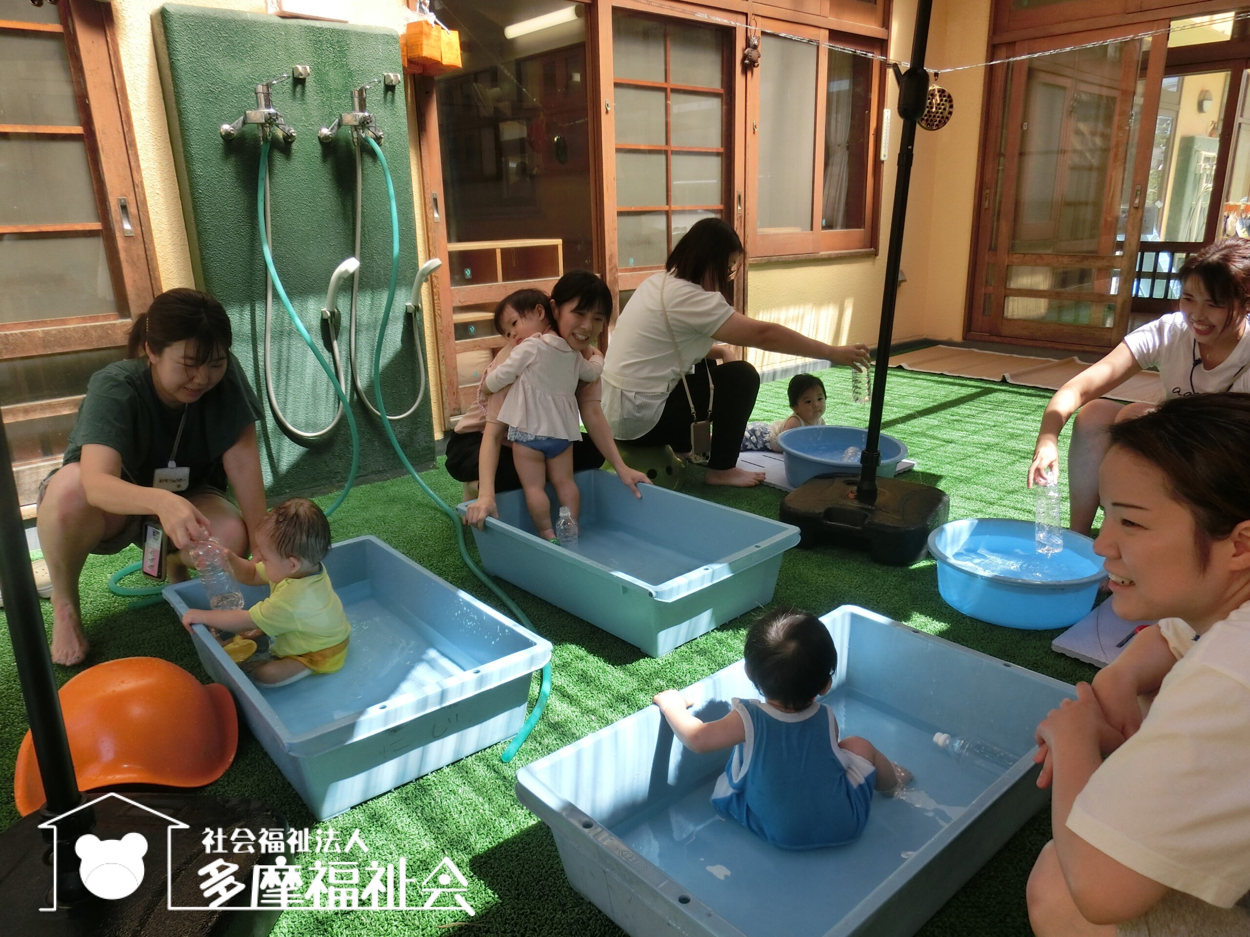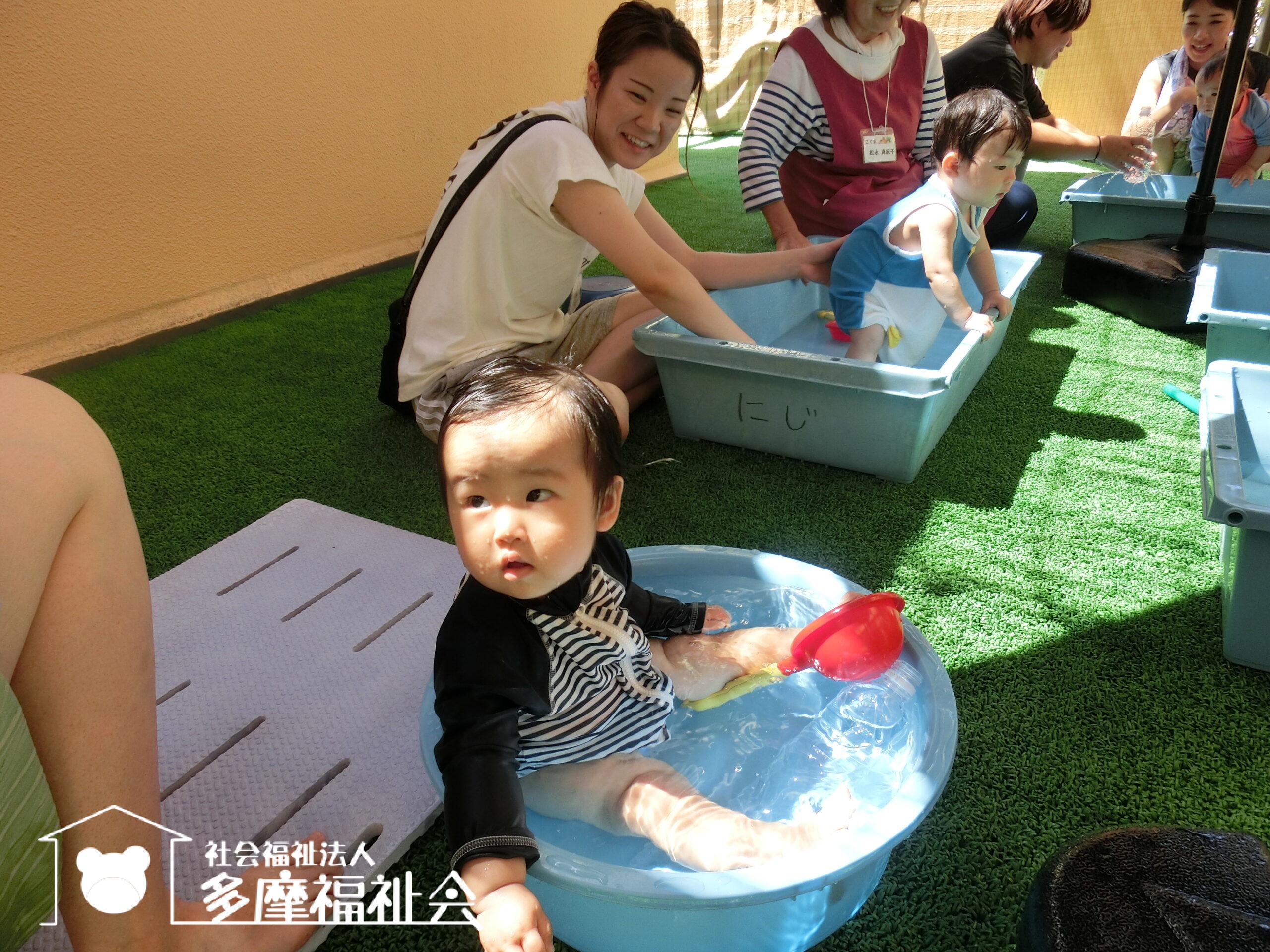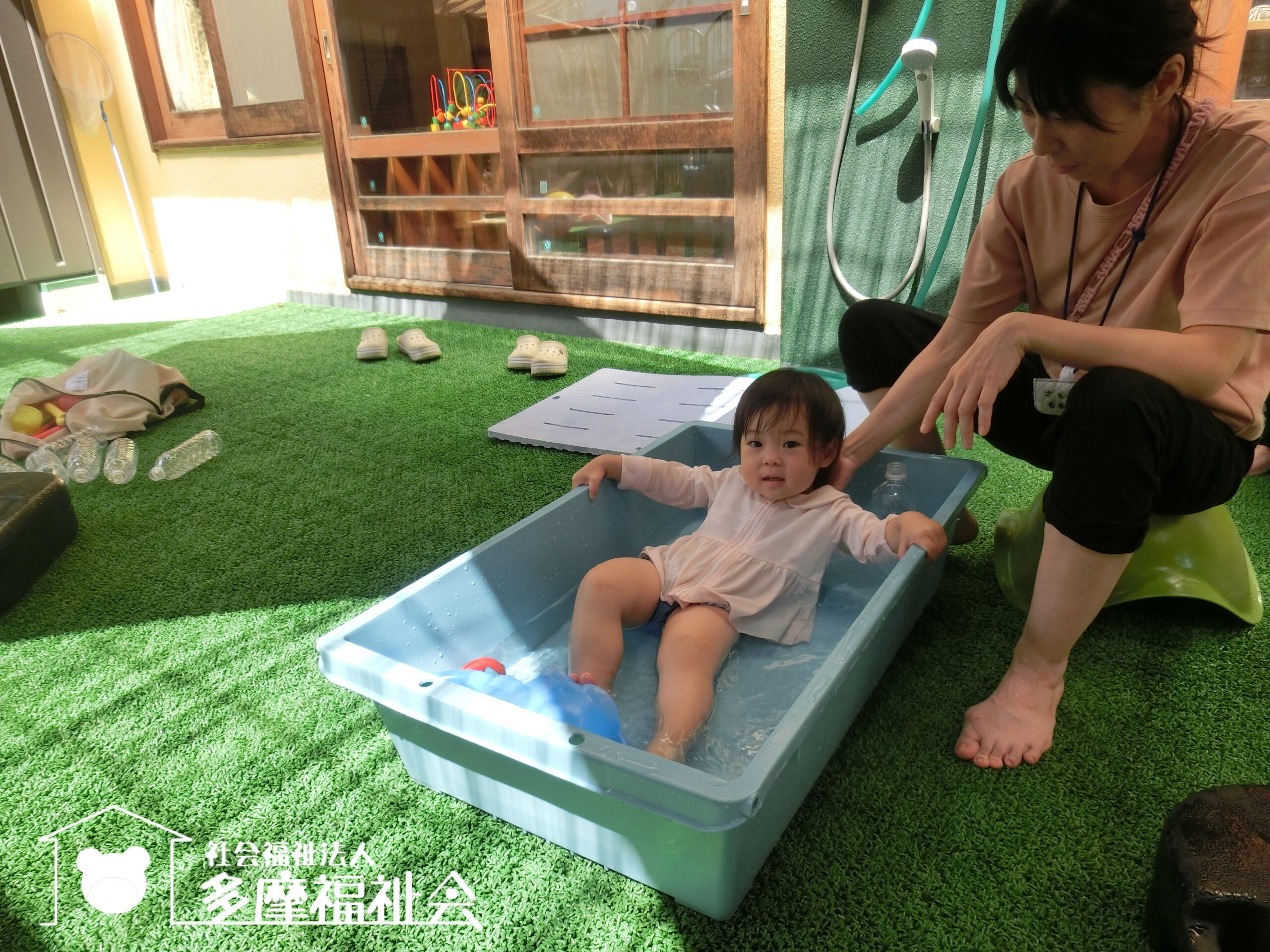 さあ着替えて、0歳児のテラスで水遊び!