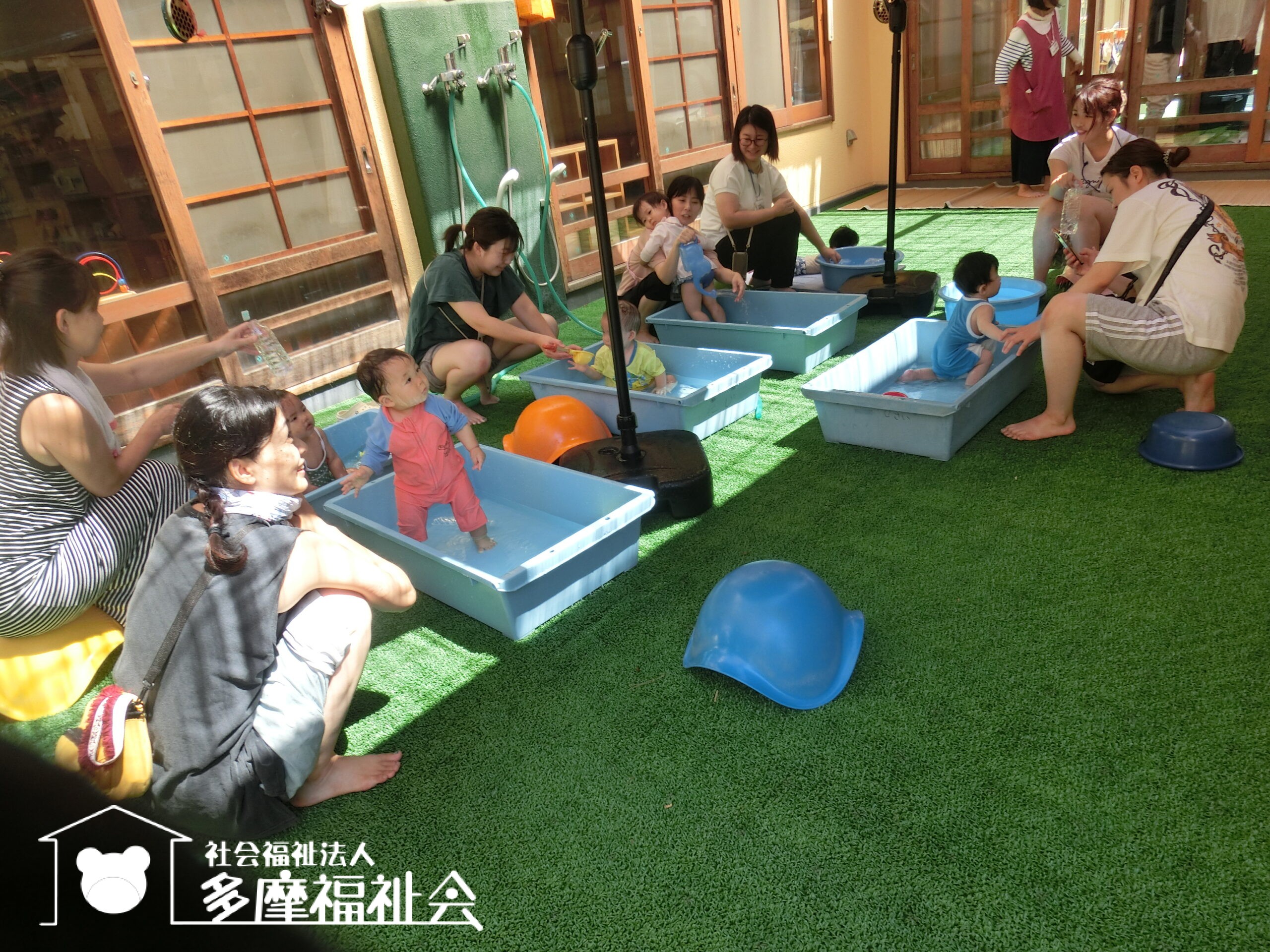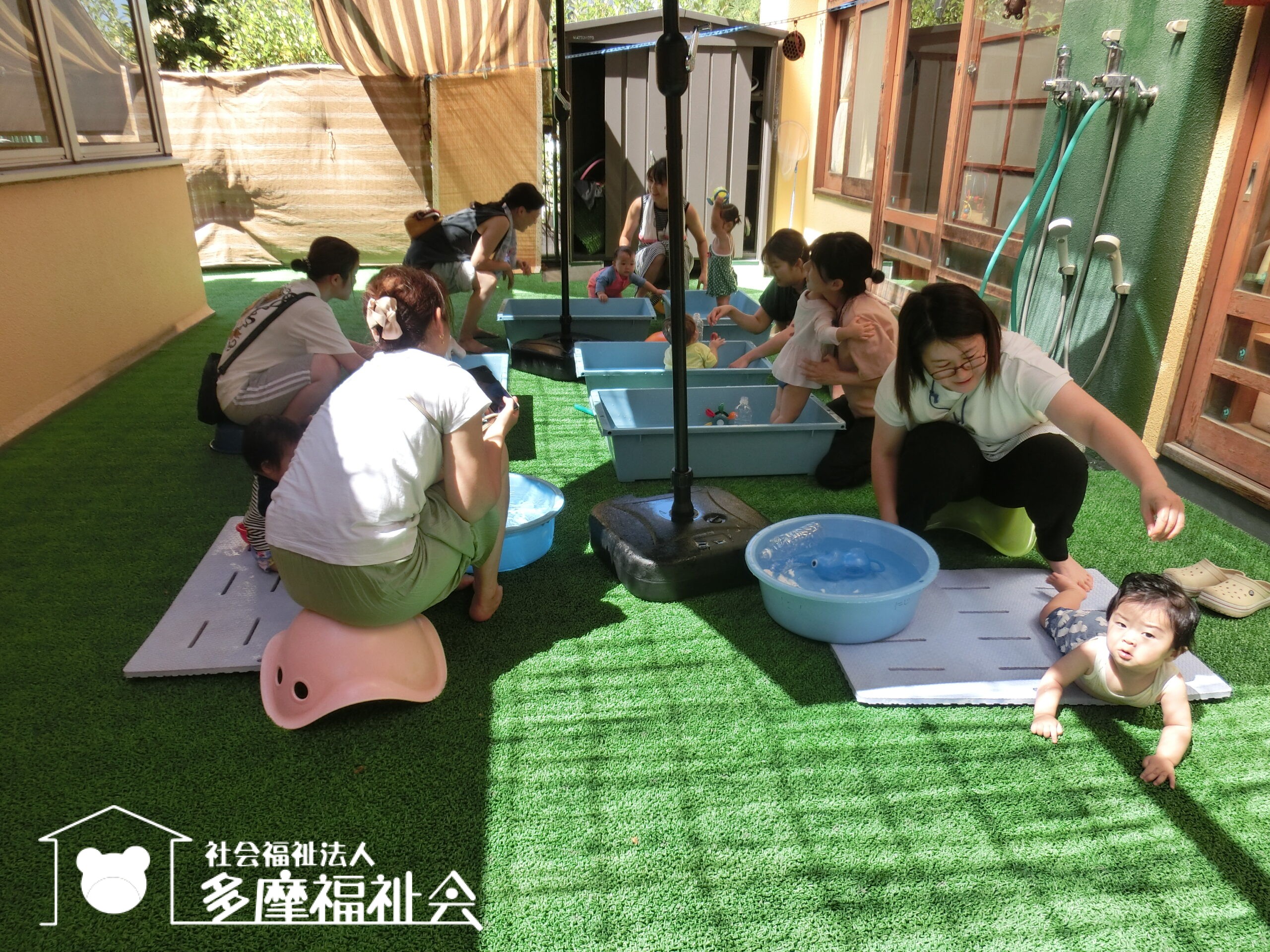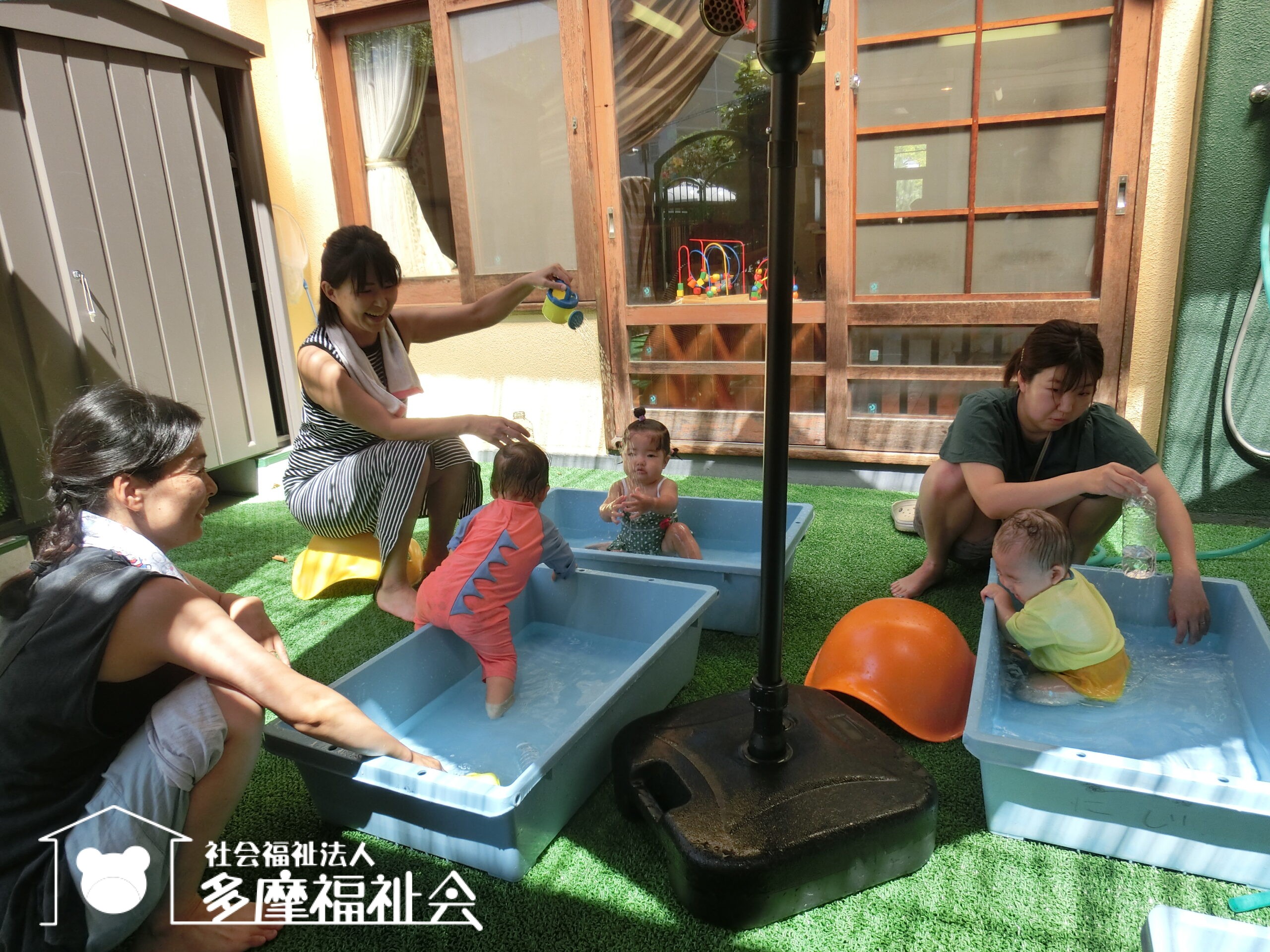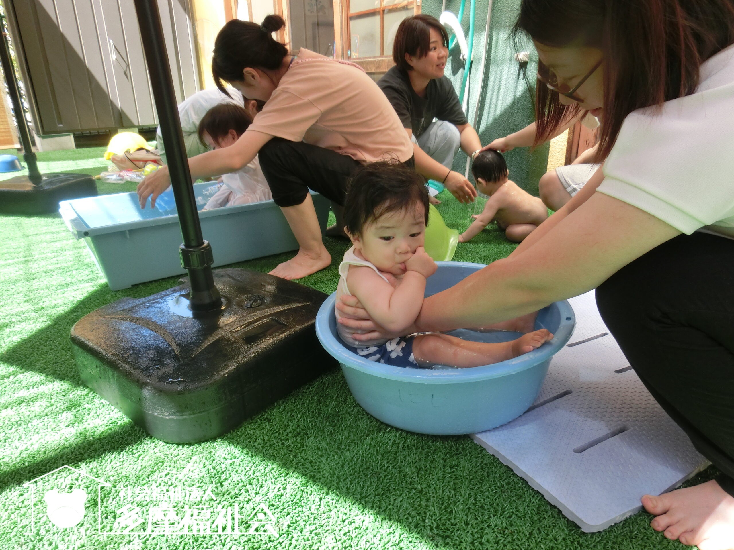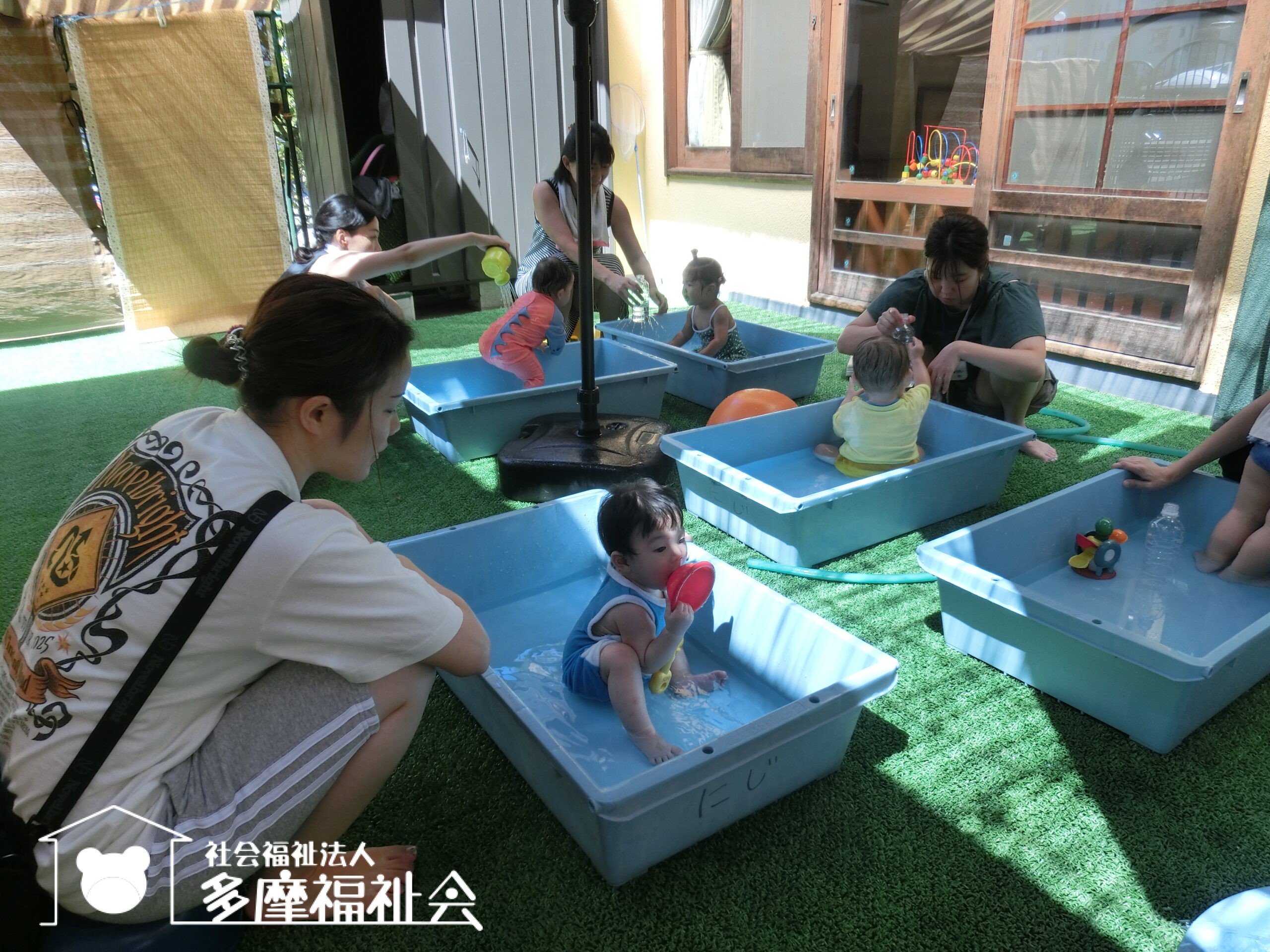 さあ着替えて、0歳児のテラスで水遊び!