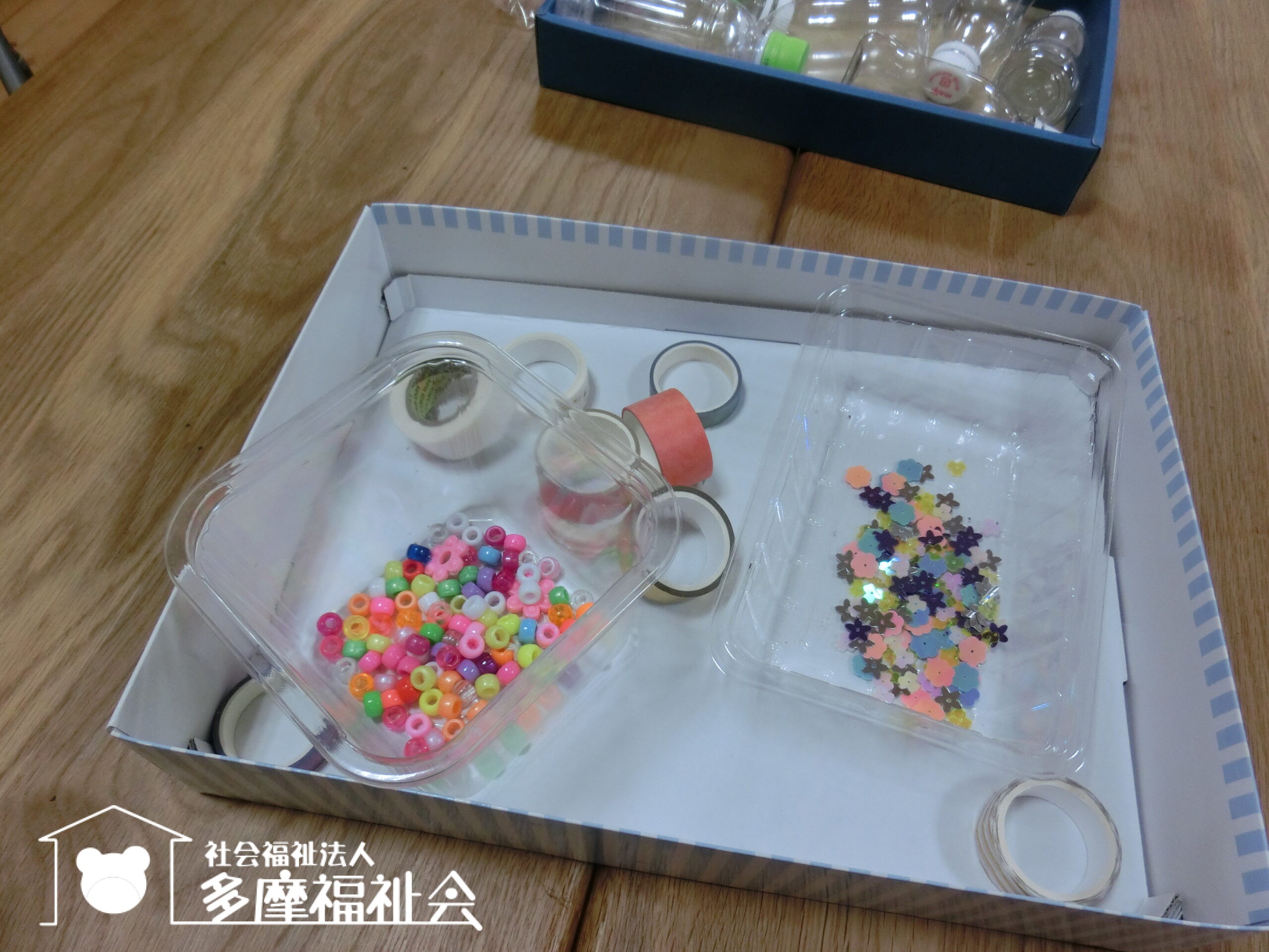 材料は ペレット、スパンコール、ビーズ、瞬間接着剤、マスキングテープ!