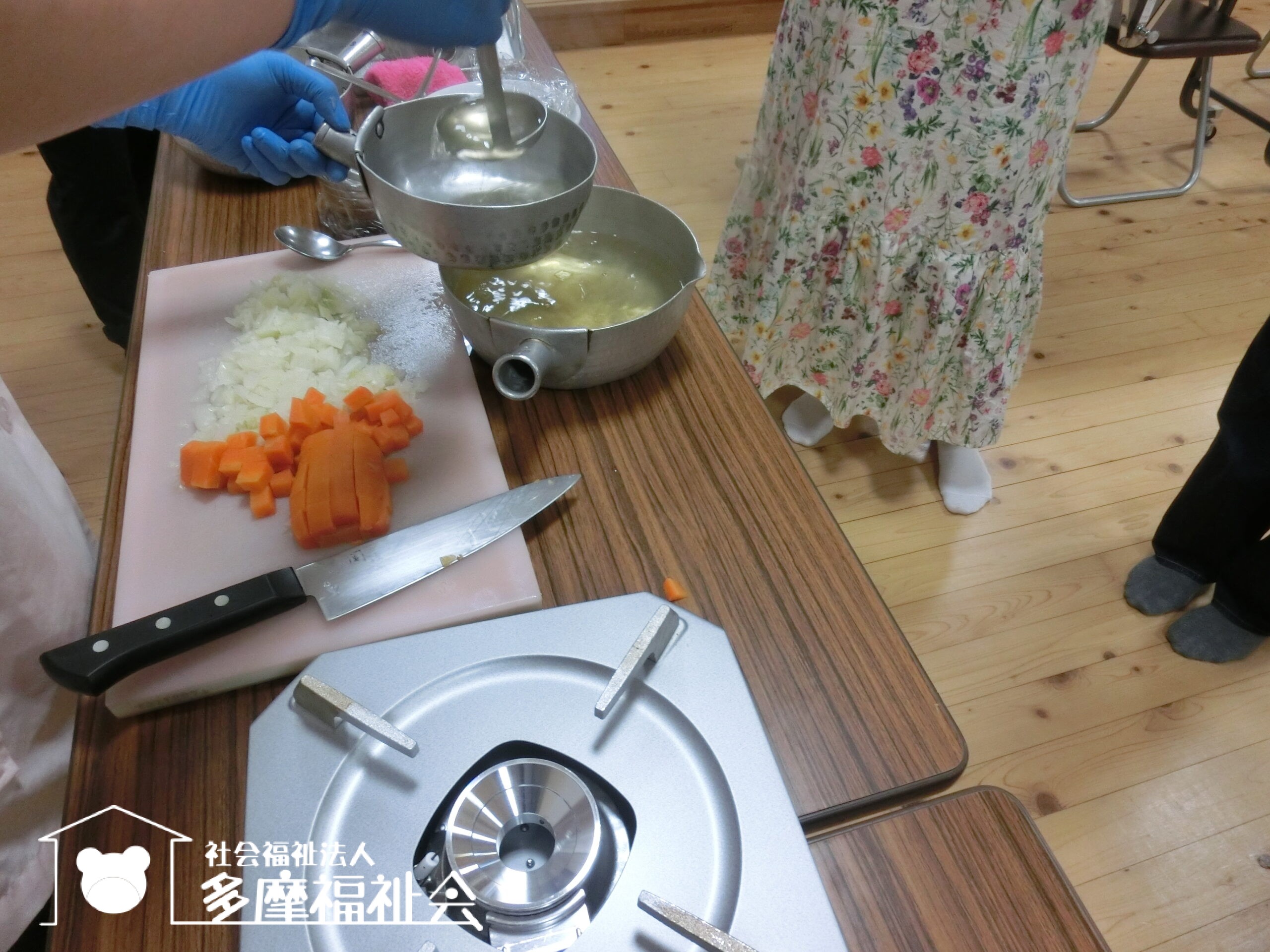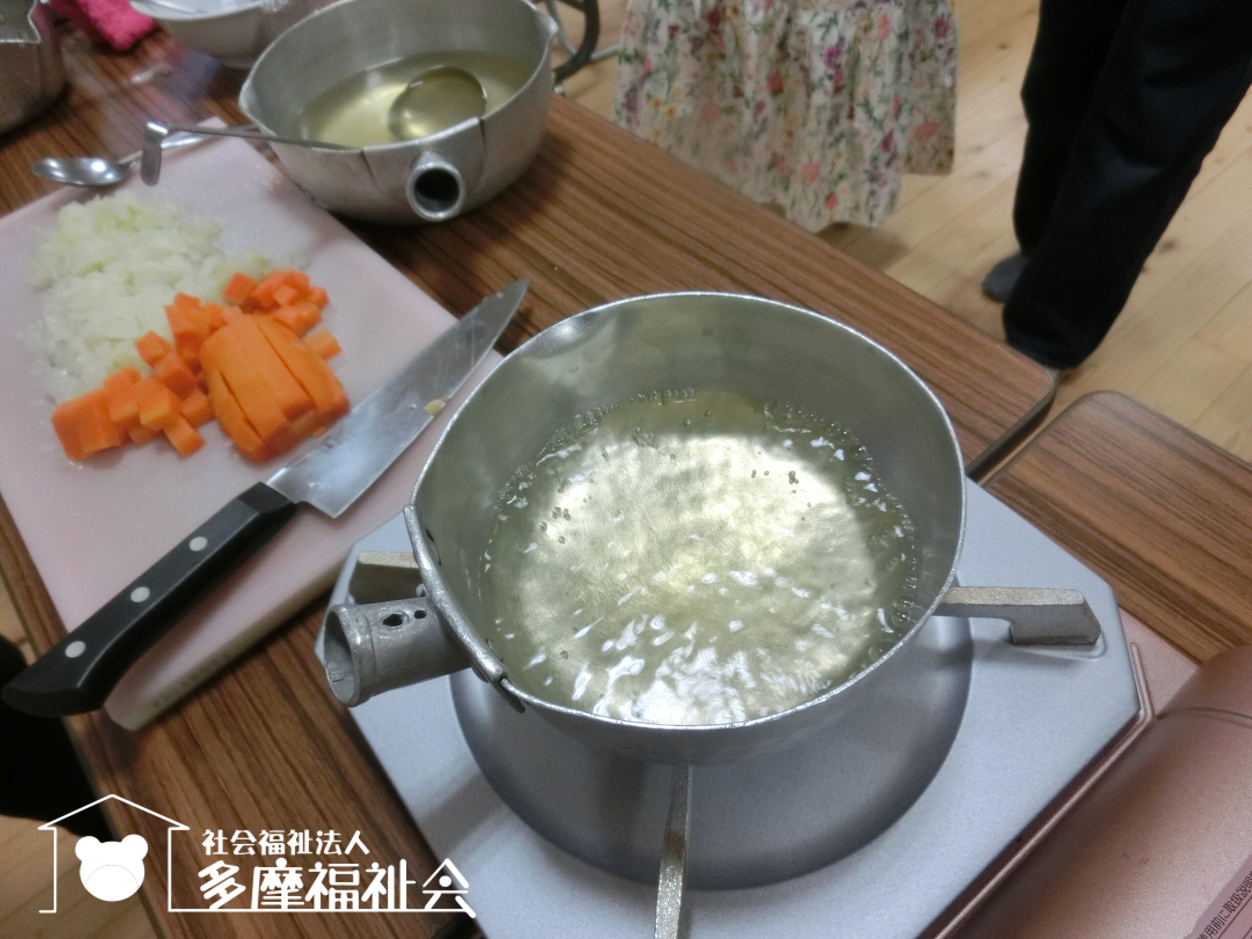 野菜スープです。野菜は大きく切ると柔らかく煮えます。味見しましたよ。甘いです。