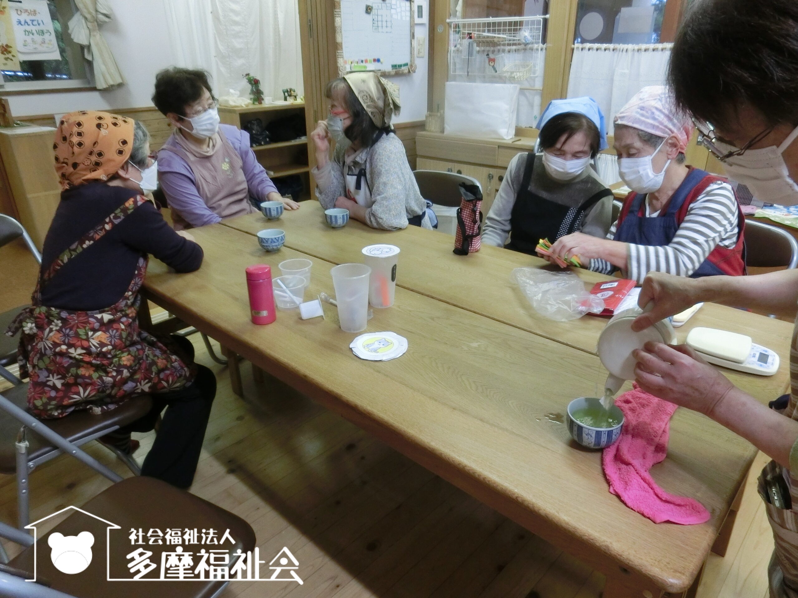給食室で蒸してもらっている間にお茶をしながらおしゃべりです。