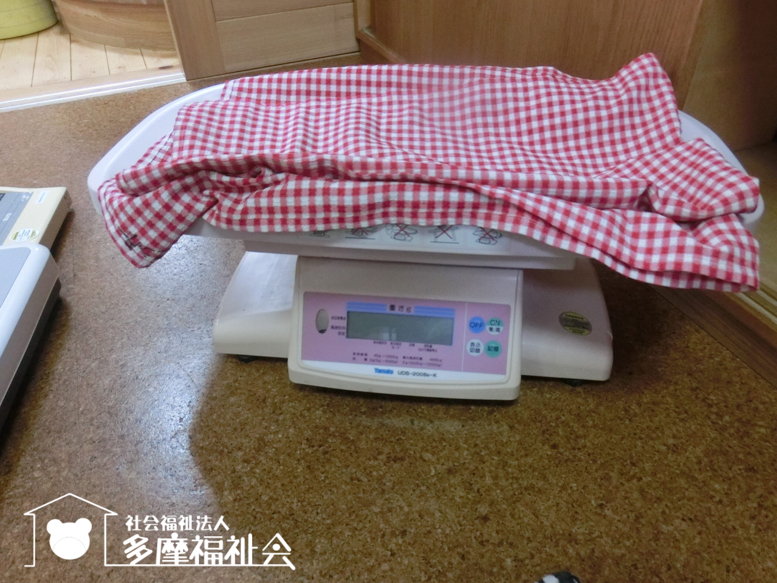 10㎏以下のお友達はこの体重計にねんねかお座りして測ります。アバウトでいい場合はお洋服を着て測ります。