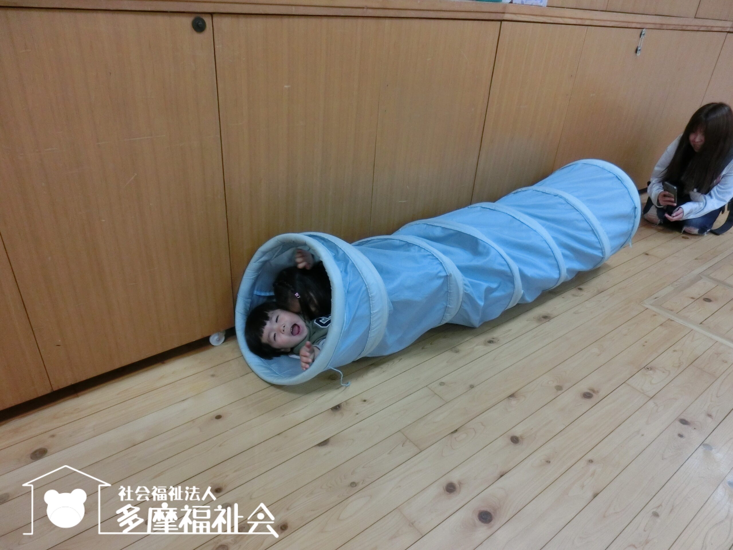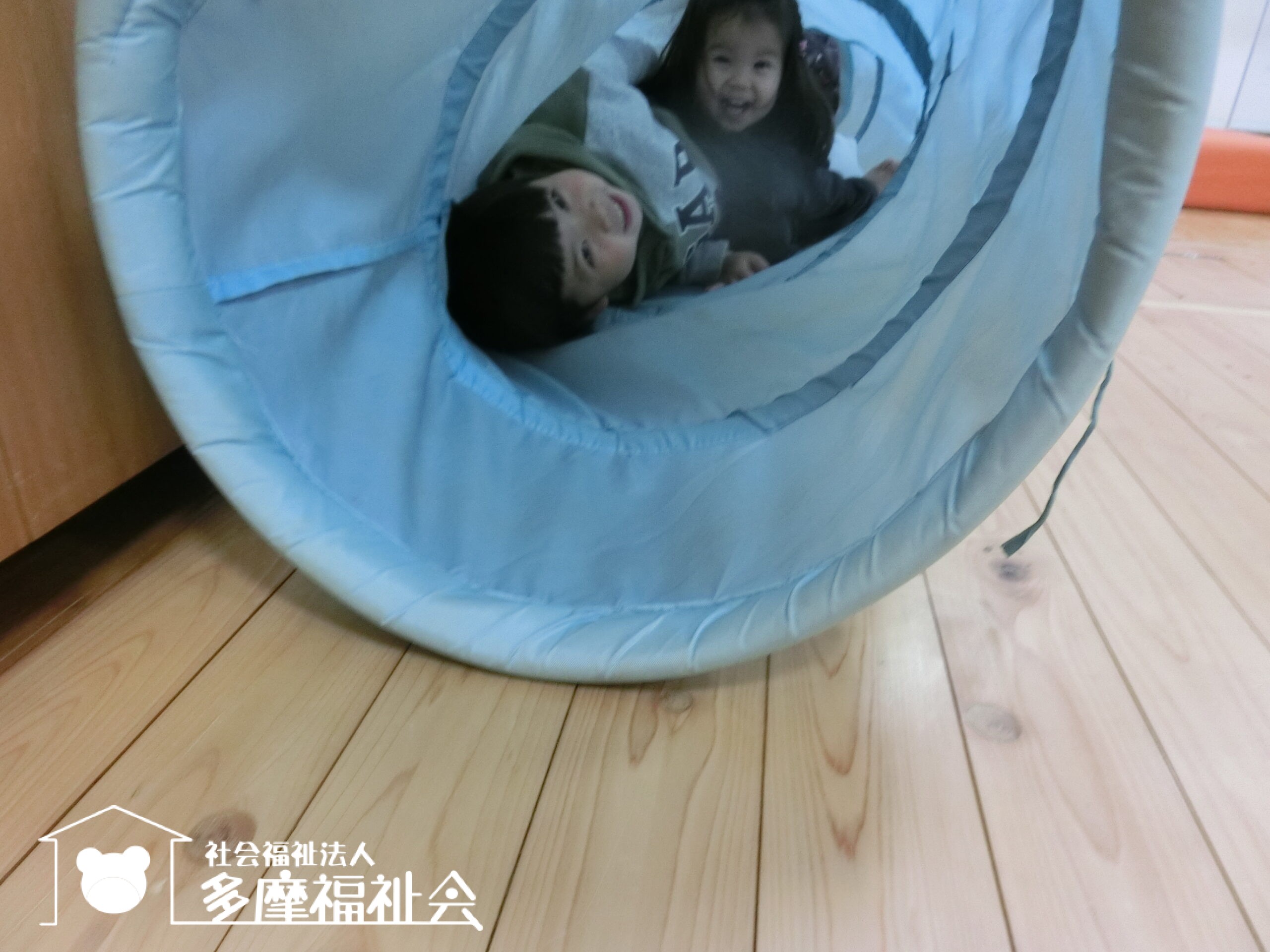 その後、広ーいホールで遊びました。トンネルにお兄ちゃんと入っているのは妹さんですよ。