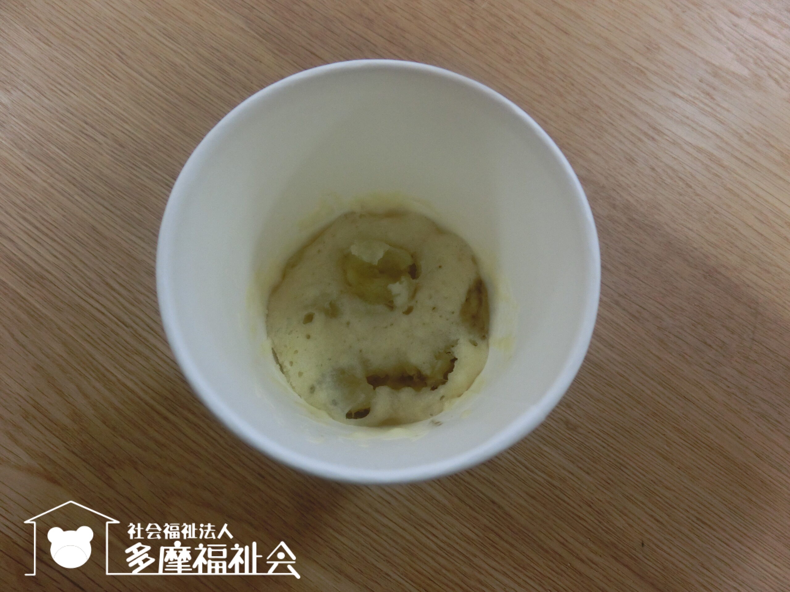 ホットケーキミックス大さじ2にお水大さじ2を紙コップや瀬戸物のコップに入れてまぜまぜ!バナナを1センチ角に切って入れまぜまぜ!