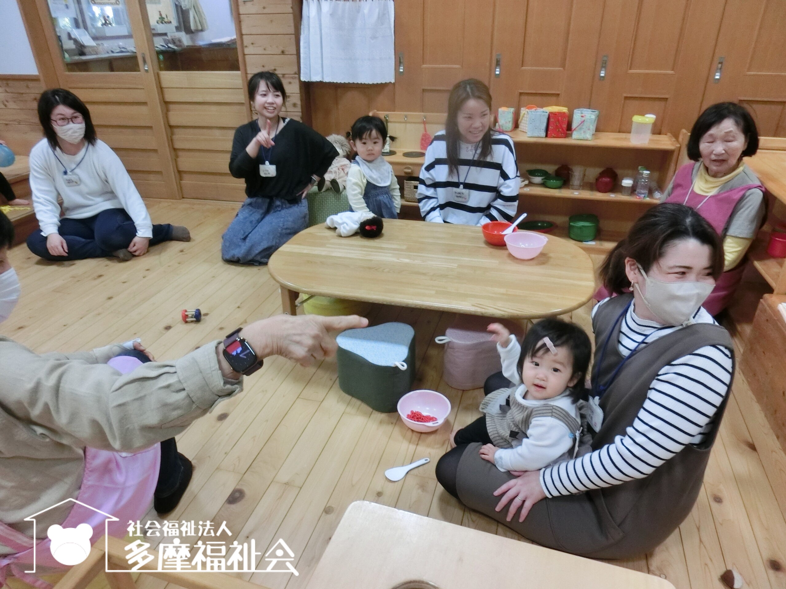 いつものように「♪ つつきましょ ぽこぺん だーれ?」。わらべうたで自己紹介」です。お子さんのお名前と月齢を教えてもらいました。