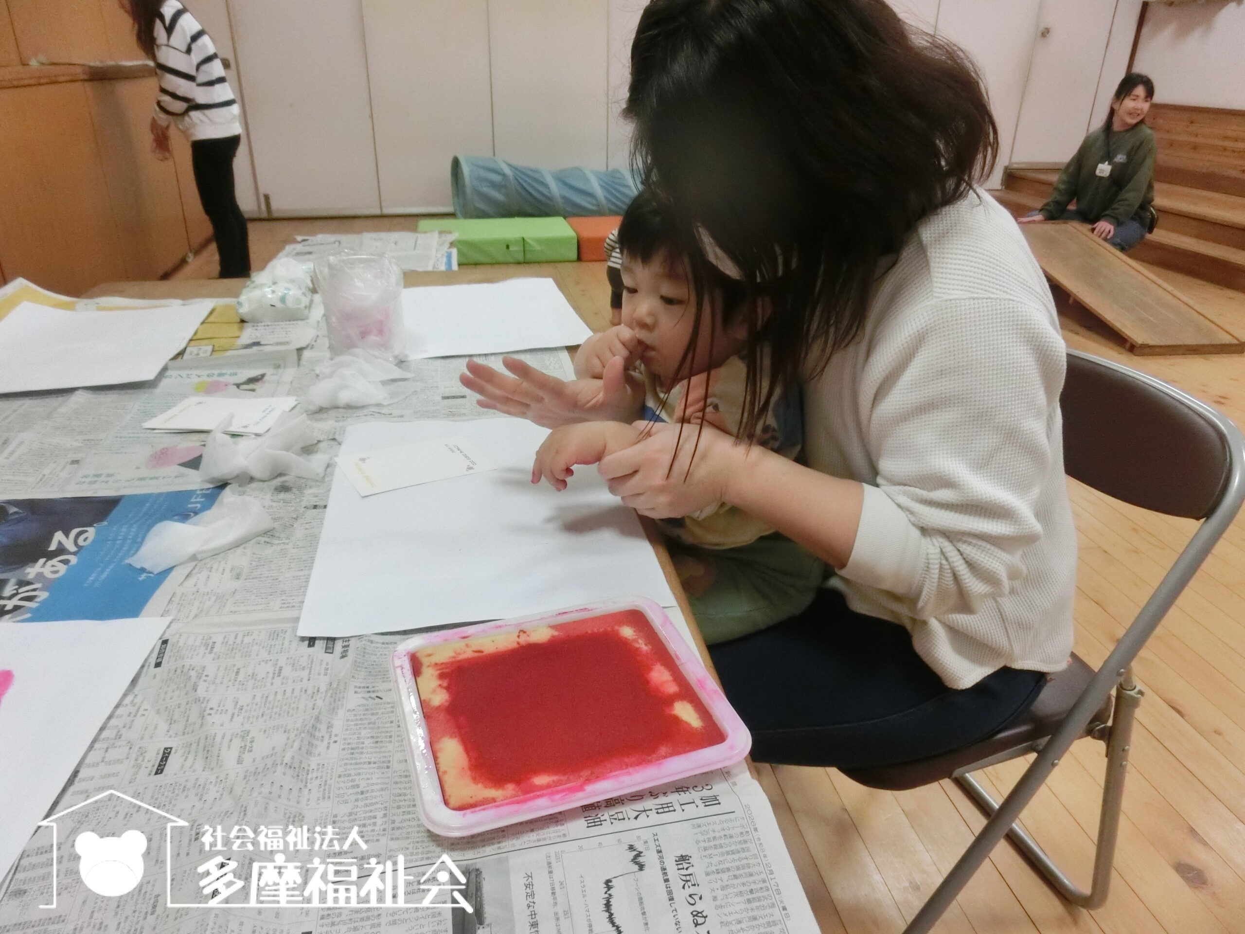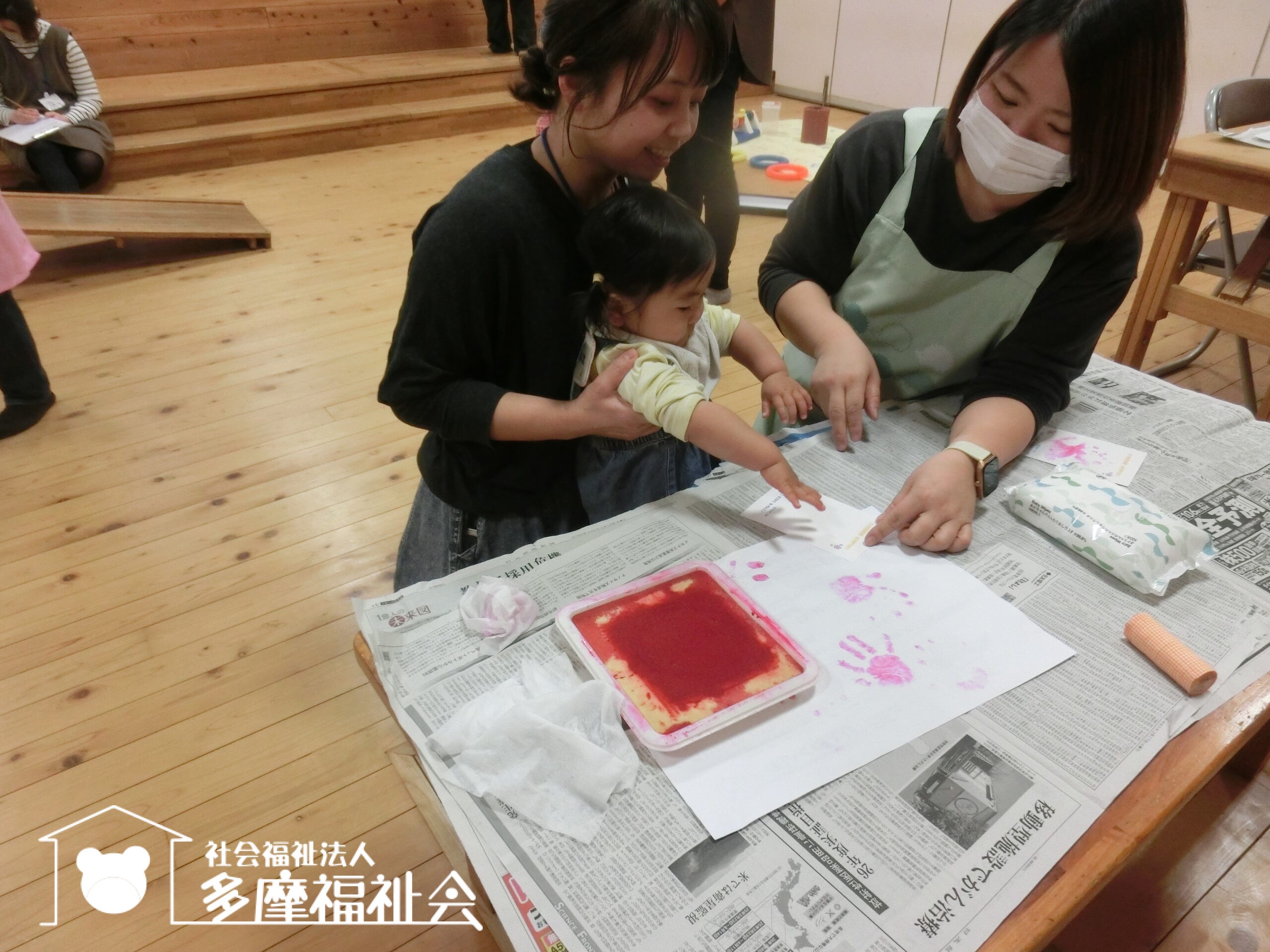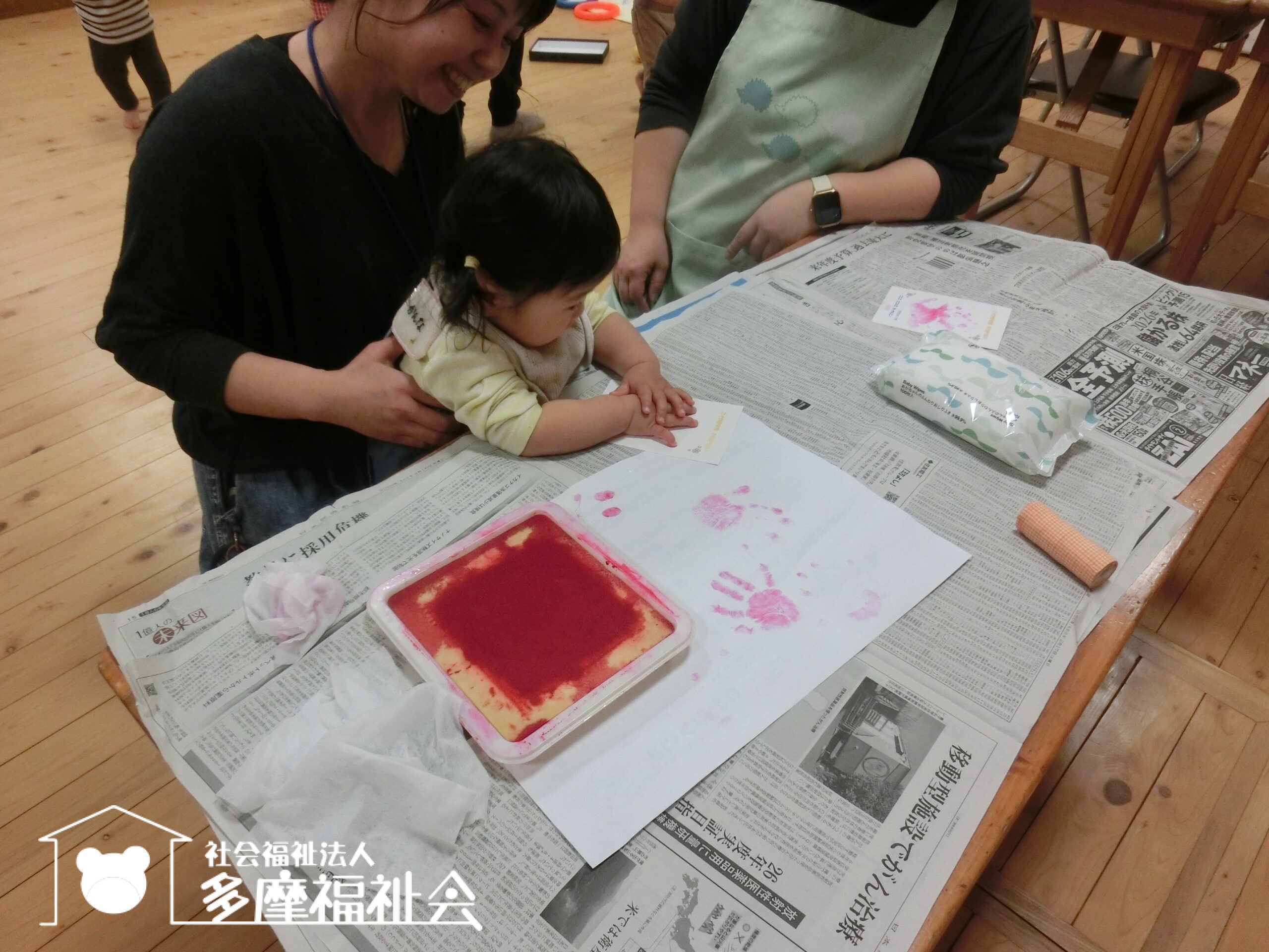 広いホールへ行って、手形とりをする気になったお子さんからスタート!