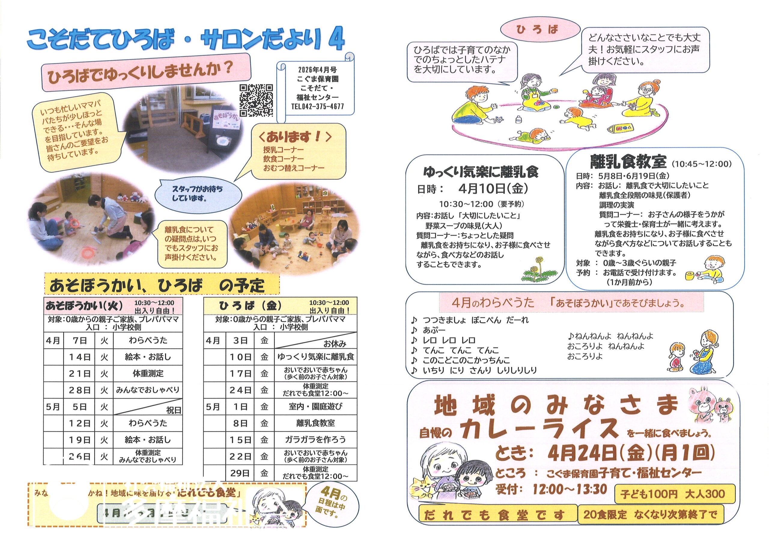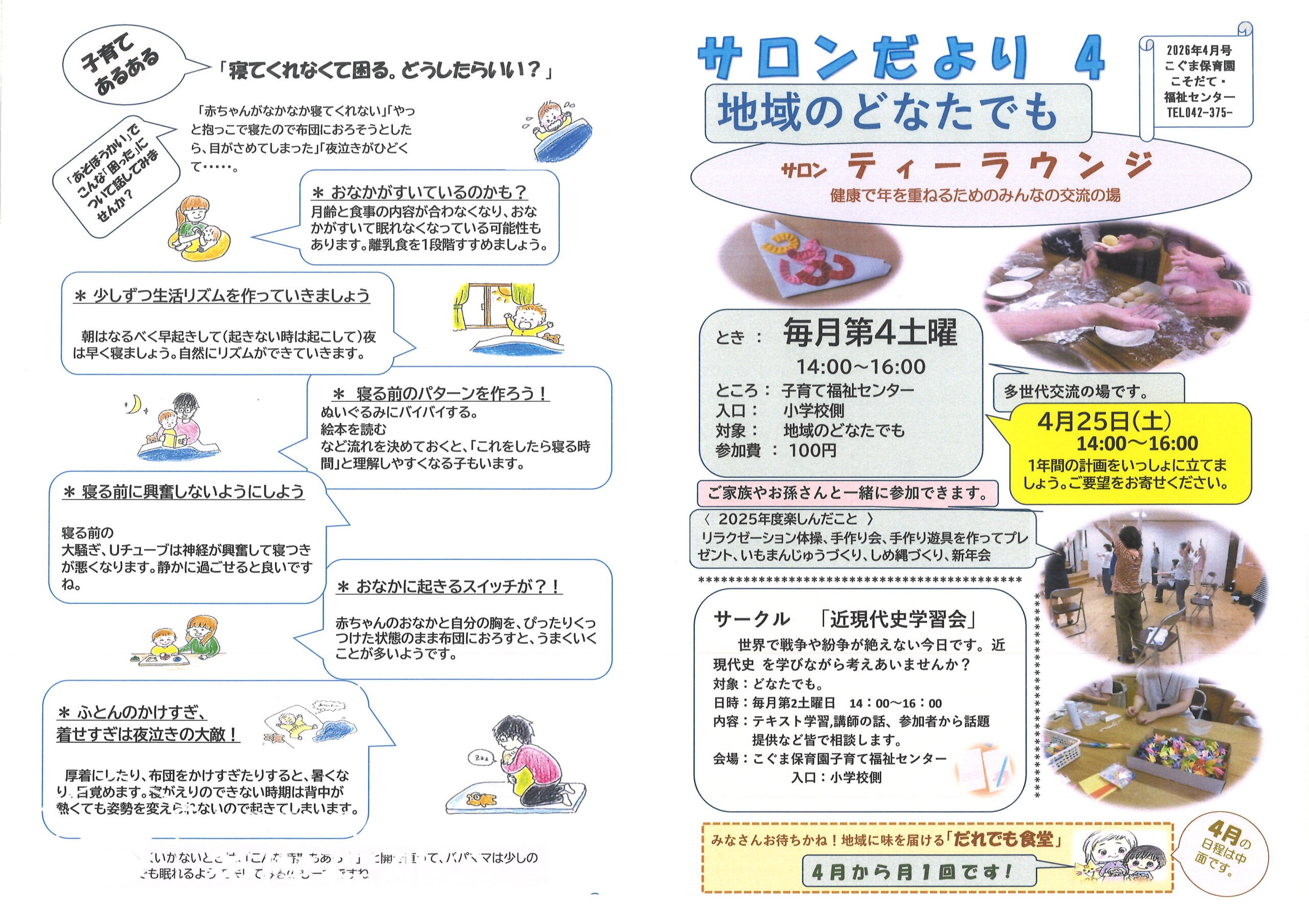 「こそだてひろば」(ひろばのおたより)は多世代交流の場「ティーラウンジ」や多世代サークル「近現代史学習会」の「サロンだより」といっしょに、「こそだてひろば、サロンだより」となります。よろしくお願いいたします。皆様のご要望をお寄せください。お待ちしています。