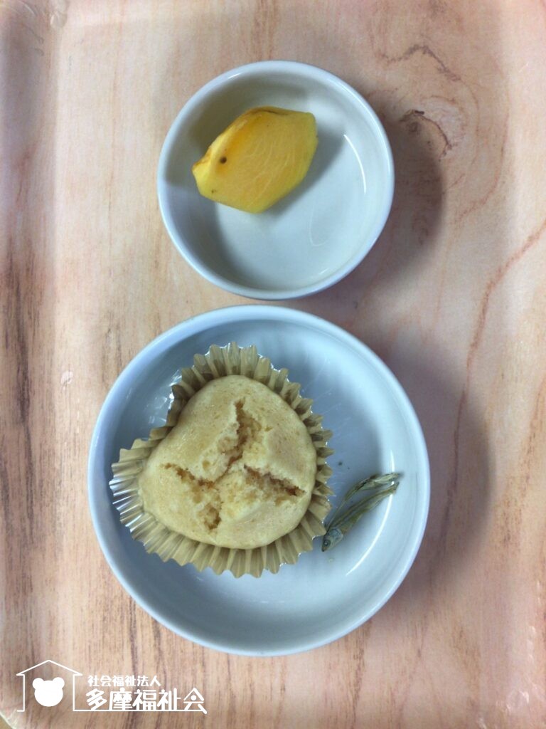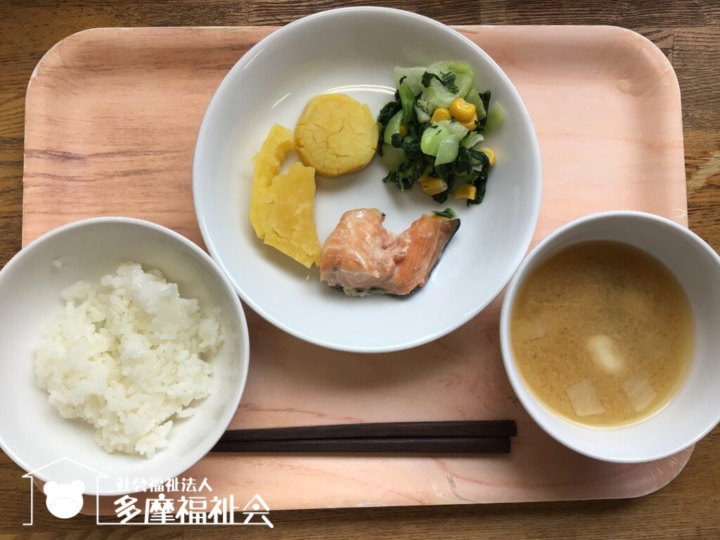10月15日 鮭の塩焼きとさつまいものオレンジ煮、チインゲンサイとコーンの炒め物です。