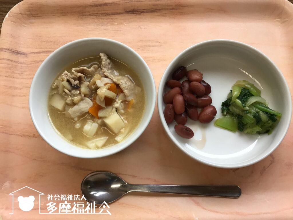 11月5日 ほうとうと金時豆、チンゲンサイのお浸しです。ほうとうにはにんじん、ねぎ、椎茸、里芋、ごぼう、豚肉が入…