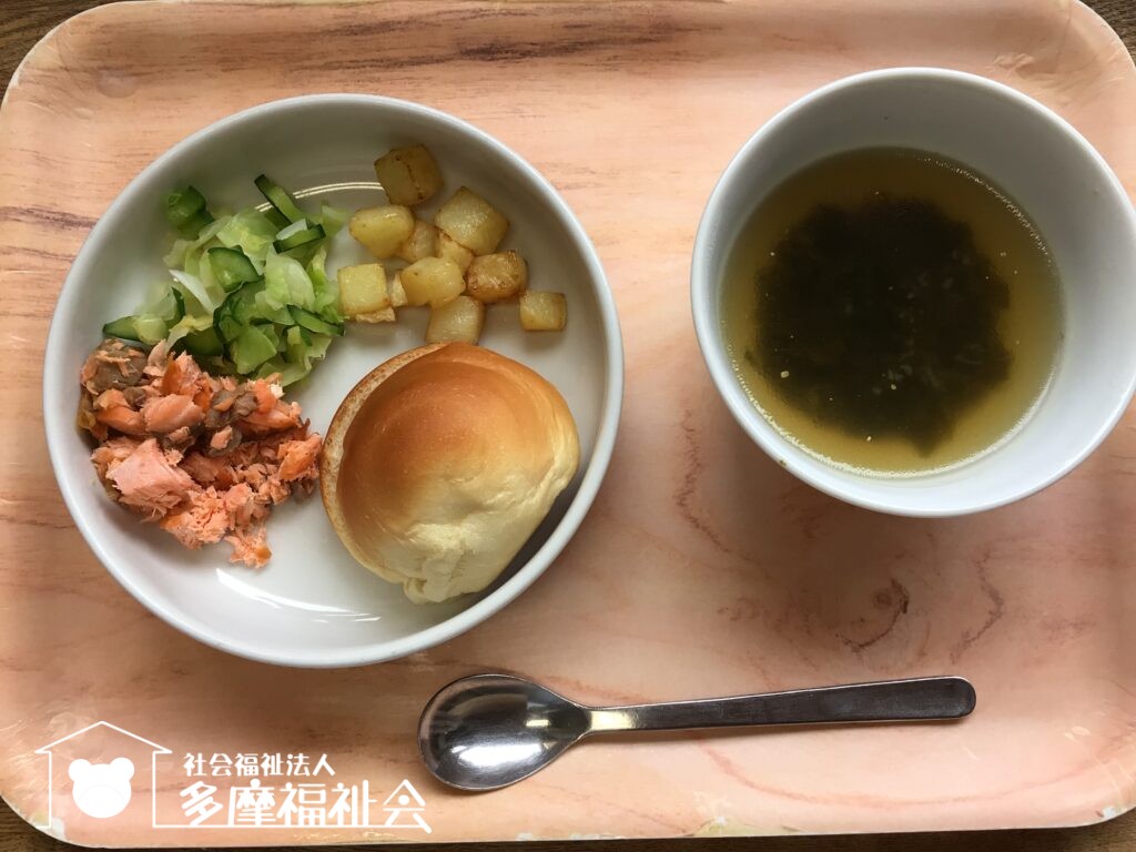 4月2日 鮭のムニエル、きゃべつときゅうりの塩もみ、揚げ新じゃが、わかめスープ、ロールパン
